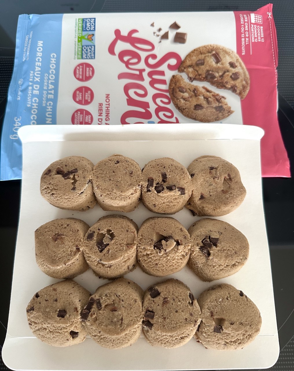 The dough is easy to work with, and I love that it’s ready to go—no need to scoop or measure anything! Since there are no eggs, I felt completely comfortable enjoying a bit of the dough raw, which was just as tasty as when it was baked. If you prefer soft and chewy cookies, these take around 10 minutes to bake to perfection. For a more crispy, crunchy texture, they take a bit longer.